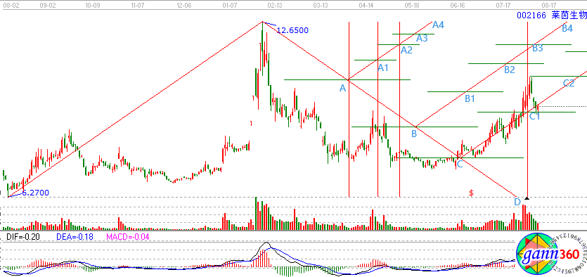 那么對于股市中的趨勢轉折,我們就可以借助贏家江恩軟件中的轉折趨勢線這個工具來進行分析研究。圖中的紅色斜線為趨勢線,綠色橫線為支撐壓力線(紅色豎線是為了方便標注轉折點對應K線的點位)下面我們就以002166萊茵生物為例子來進行詳細的分析。