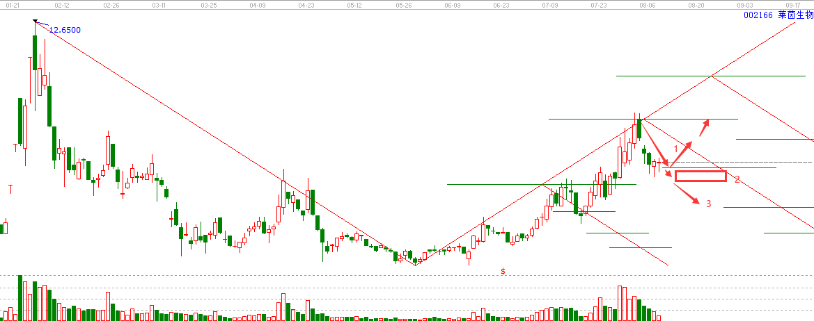 由于我們分析研究的周期時間跨度有近一年,因此在結果上可能會有幾天的小誤差,想要更加精確,只需要研究小周期就可以了。我們通過上面的研究分析得到,股票會沿著紅色斜線標注的趨勢方向運行,會在趨勢轉折點位發生走勢的變化,同時會在綠線的位置獲得支撐或者壓力,那么接下來我們就通過這個工具來對002166萊茵生物未來的走勢進行分析預測。