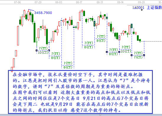 在圖中我們可以看到 近期大盤重要的高點(diǎn)和低點(diǎn)以及低點(diǎn)和低點(diǎn)之間的時(shí)間往往是7個(gè)交易日 9月21日的高點(diǎn)后7個(gè)交易日將會(huì)是下周二 也就是9月29日 能否在高點(diǎn)后的7個(gè)交易日出現(xiàn)新的轉(zhuǎn)折點(diǎn),我們拭目以待 感受7這個(gè)數(shù)字的神奇。