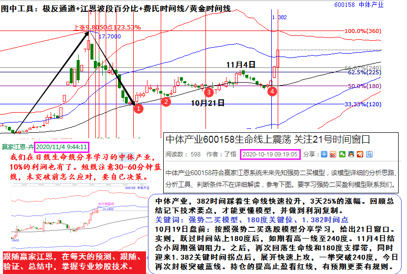 中體產業,382時間踩著生命線快速拉升,3天25%的漲幅?;仡櫩偨Y記下技術要點,才能更懂模型,并做到利潤復制。10月19日盤前:按照強勢二買選股模型分享學習,給出21日窗口。實則,躍過時間站上180度后,如期看高一線至240度。11月4日結合小周期強調阻力。之后,再次回落生命線和180度支撐帶,同時迎來1.382關鍵時間拐點后,展開快速上攻,一舉突破240度,今日再次封板突破藍線。持倉的提高止盈看紅線,有預期更要有規則。
