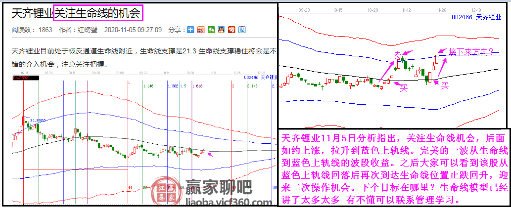 天齊鋰業(yè)11月5日分析指出,關(guān)注生命線機(jī)會,后面如約上漲,拉升到藍(lán)色上軌線。完美的一波從生命線到藍(lán)色上軌線的波段收益。之后大家可以看到該股從藍(lán)色上軌線回落后再次到達(dá)生命線位置止跌回升,迎來二次操作機(jī)會。下個目標(biāo)在哪里?生命線模型已經(jīng)講了太多太多 有不懂可以聯(lián)系管理學(xué)習(xí)。