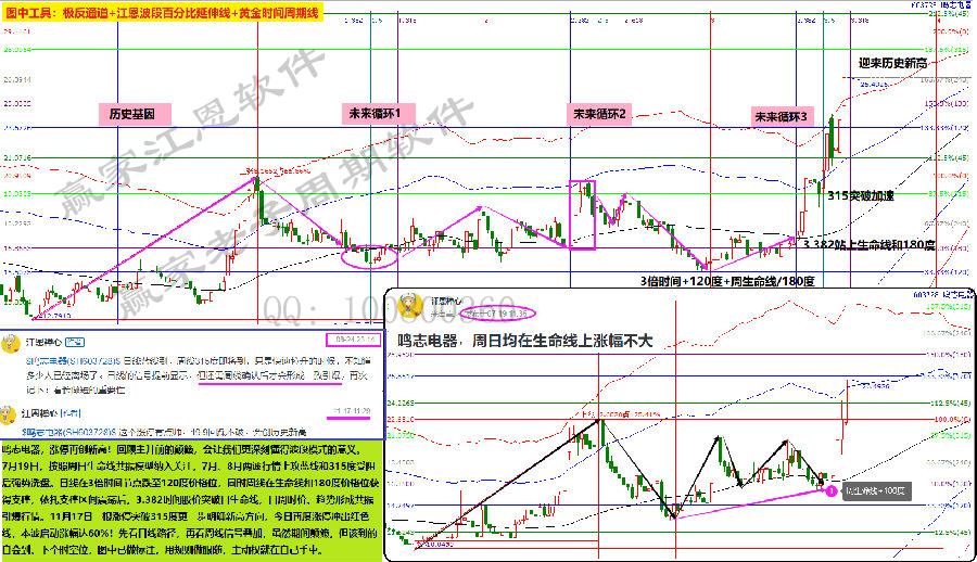7月19日,按照周日生命線共振模型納入關注。7月、8月兩波行情上攻藍線和315度受阻后強勢洗盤。日線在3倍時間節點跌至120度價格位,同時周線在生命線和180度價格位獲得支撐,依托支撐區間震蕩后,3.382時間股價突破日生命線,日周時價、趨勢形成共振引爆行情。11月17日一根漲停突破315度更一步明確新高方向,今日再度漲停沖出紅色線,本波啟動漲幅達60%!先看日線路徑,再看周線信號疊加,雖然期間顛簸,但該到的自會到。下個時空位,圖中已做標注,用規則做跟隨,主動權就在自己手中。
