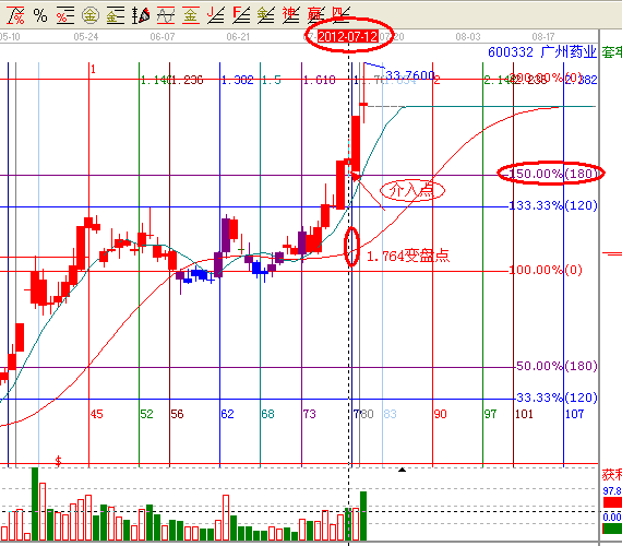 第二:依據(jù)贏家江恩分析系統(tǒng)時(shí)間工具,黃金時(shí)間周期線,提示此票7月12日,是黃金時(shí)間周期線的第二個(gè)循環(huán)的1.764的時(shí)間變盤點(diǎn),(黃金時(shí)間周期線作圖,起點(diǎn)為2011年10月24日,終點(diǎn)2012年5月24日的連線)如下圖