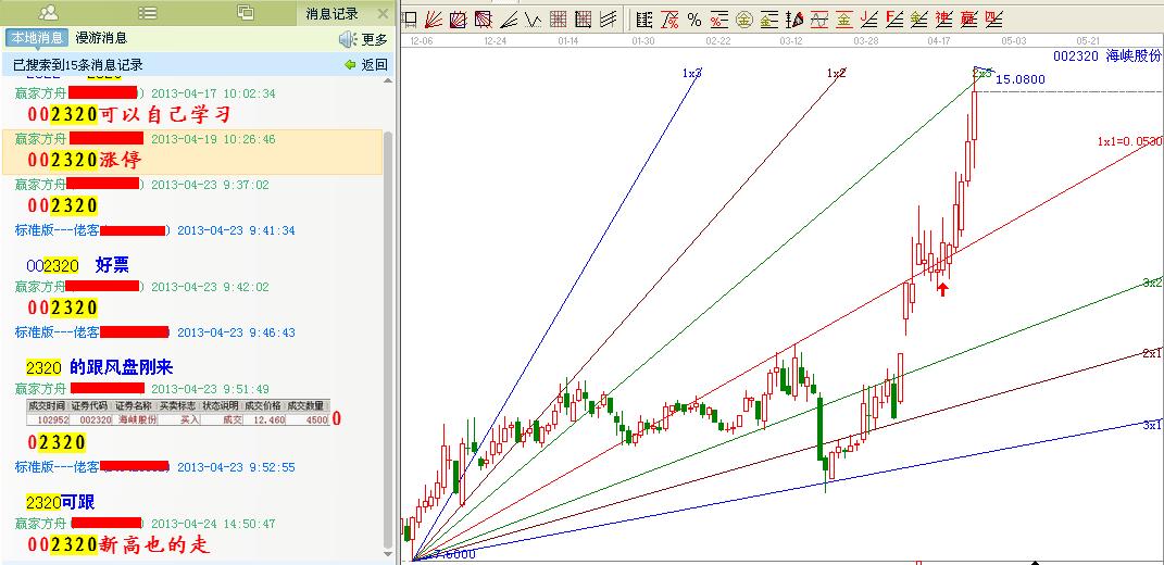 002320海峽股份在7.60見底后快速上行至10.88位置快速殺跌洗盤這個重要的底高點構成沖角度線1*1線,連續5天的暴跌剛好跌至上升角度線3*1線的位置止跌上行,然后按照角度線運行規則站穩一線看高一線原則穩步上揚,基本都是天天陽線,說明了其主力志在高遠特別是在拉升前13-04-03日一個大陰線洗盤隨后直接漲停方式突破3*2線 直接上行至1*1線位置短期漲幅超過30%很多人都望而生畏,不管大盤如何殺跌,主力始終為啥1*1角度線震蕩并且都是陽線,2013-04-16日一個假跌破1*1角度線吸引了我的眼球,偶后在2013-04-17日開始對其進行了交易,讓大家多用心學習這個個股研究,按照江恩規則角度線支撐一線看高一線原則,角度線1*1線不破最好看高至2*3線的位置,介入后震蕩一日后開始了向角度線2*3線進攻,好不理會大盤漲跌我行我素,走出了一個較為獨立的行情,今天最高點觸摸角度線2*3線位置實現了6個交易日23%的收益.