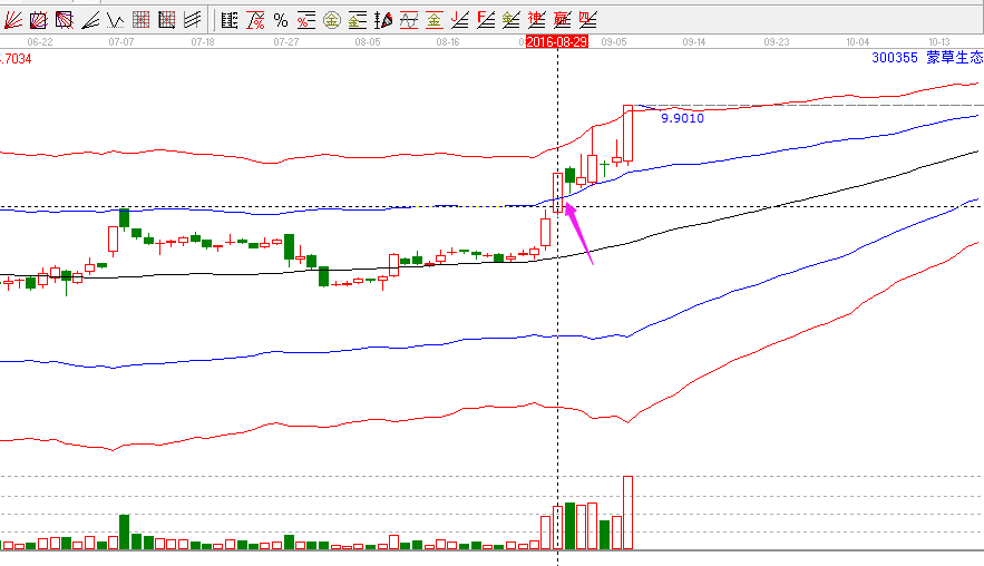 江恩技術分析:300355在8月29日開始關注,通過極反通道、趨勢線,以及黃金時間周期線的分析,再加上成交量的配合,在短線和波段上都是有很大的潛力的,因此開始操作。