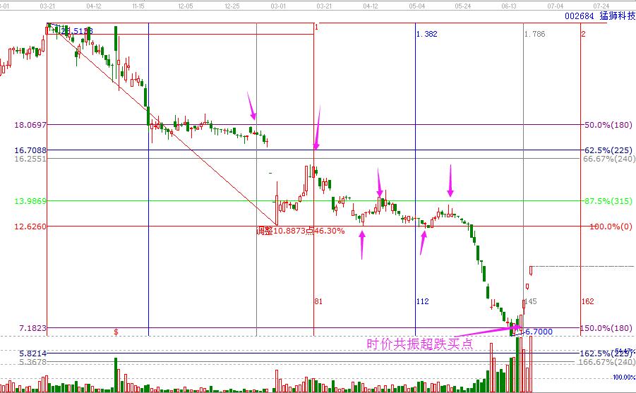 在上面的圖形中,做波段百分比延伸線,可以看到個股在連續大跌之后,在百分比150.0%的位置獲得價格支撐,按照江恩價格操作規則,買在價格支撐,賣在價格阻力,知道為站穩就是新的買點。個股在支撐位橫盤幾天時間,經過大跌-大漲-大跌-漲停,反復糾結最終確認價格支撐位有效性,從價格上單條件符合買進條件。