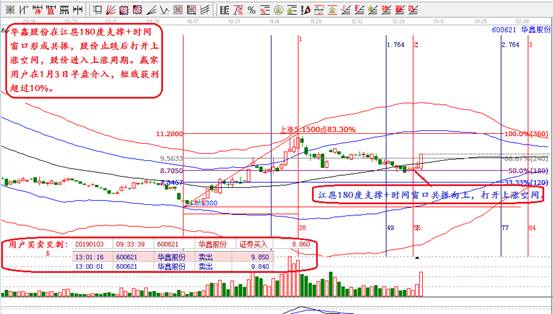 華鑫股份在江恩180度支撐+時(shí)間窗口形成共振,股價(jià)止跌后打開(kāi)上漲空間,股價(jià)進(jìn)入上漲周期。贏家用戶在1月3日早盤(pán)介入,短線獲利超過(guò)10%。