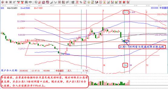 中信建投,在零度價(jià)格循環(huán)位及藍(lán)色線見(jiàn)頂回落,隨后回踩至江恩零度支撐,并在江恩1.5倍時(shí)間窗口止跌,隨后反彈,贏家用戶在時(shí)間點(diǎn)止跌后1月2日介入,該股短線上漲15%以上。