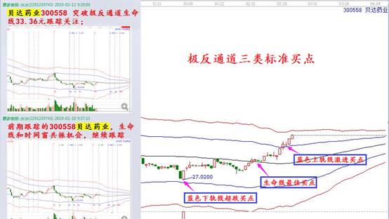 2. 穩(wěn)健性生命線最佳買點:生命線為贏家江恩最佳買點,首先個股向上突破生命線,進入強勢區(qū)域,個股處于強勢啟動位置,且在生命線有價格支撐,所以在生命線附近參與就最為安全。2月12日,貝達藥業(yè),在生命線最佳穩(wěn)健買點選出,18號生命線附近再次提示跟蹤,當天開始啟動,25號到達藍色上軌線附近,生命線——藍色上軌線,6個交易日,短線13%利潤到手。