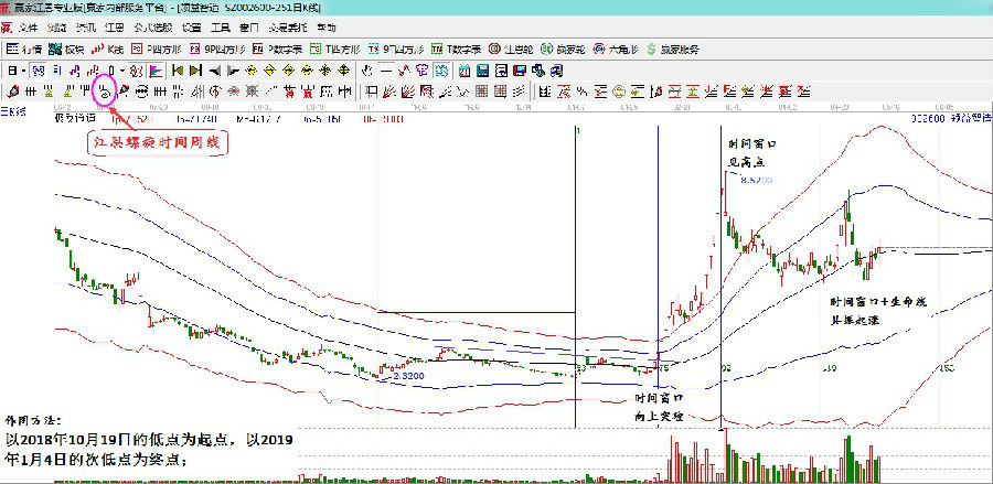 本周帶大家學習一個預判時間窗口的工具-江恩螺旋時間周期線。時間分析是有江恩首次引入到金融市場中,開啟了金融市場技術分析的新方向,江恩理論認為,時間是決定市場走勢的最重要因素,而經過我們的長期實戰,發現當時間和價格形成四方時,市場會發生趨勢的反轉,或出現大陰大陽的劇烈波動,同時伴隨著成交量的放大。我們進行時間分析,最重要的目的是判斷市場是處于上漲或下跌趨勢的什么階段,根據價格做好下一步走勢方向的預判。江恩螺旋時間周期線就是這樣的一個具備超強實戰意義的時間分析工具。接下來,筆者以兩個股票的具體走勢為例做個展示幫助大家了解該工具的具體應用。