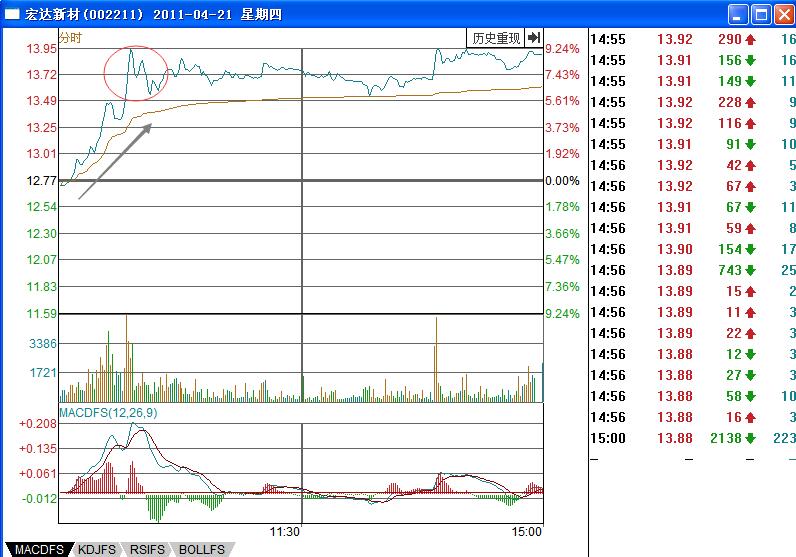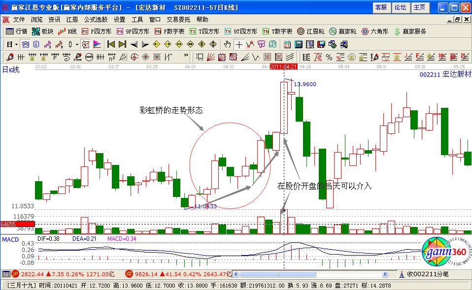 如圖宏達新材(002211)在2011年4月份的股價走勢變化,股價一直處于明顯的上漲趨勢中,而且在上漲的過程中出現(xiàn)的陽線多于陰線的走勢,4月8日的時候股價開始了一根大陽線的拉升走勢,之后出現(xiàn)的回調形成了“彩虹橋”的基本走勢形態(tài),對應的量能配合比較合理,形成的是量升價漲,價跌量縮的基本走勢形態(tài)。
