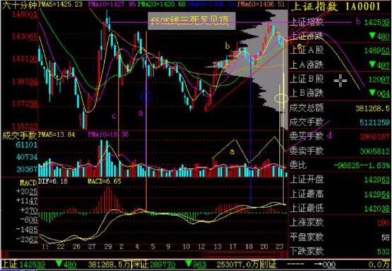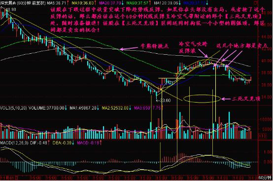 如上圖所示,該股在下跌過程中放量突破下降趨勢線反彈,如果你在頭部沒有出局、或者搶了這個反彈的話,那么都應該在這個60分鐘K線反彈至冷空氣帶附近那個三死叉又見頂處,隨時準備撤退!該股在三死叉又見頂區間還同時構筑了一個小型的圓弧頂,那區間都是賣出的機會!