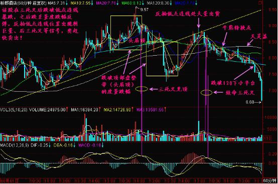 如上圖所示該股的頭部區間60分K線,有三組三死叉信號,其中第一二兩組組合成三死叉頭背離,60分鐘的三死叉就是一個短期頭部的信號,必須出貨!
