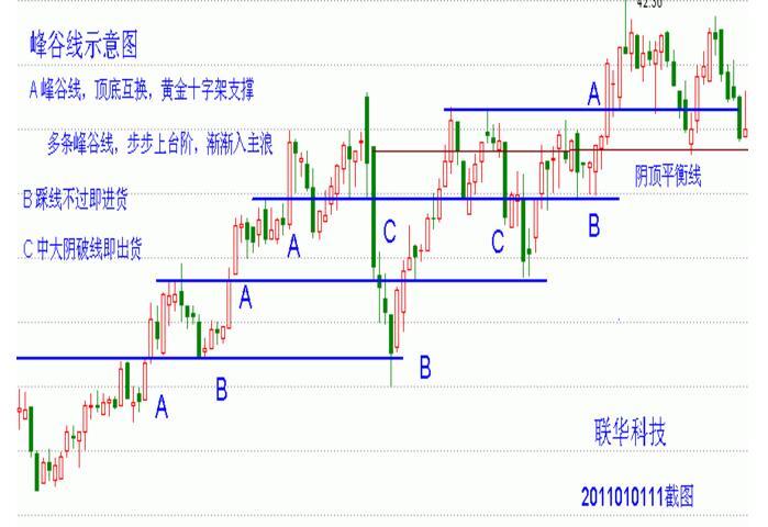 由左側峰頂和右側谷底精準點連線而成,無縫重合,在實戰中比較少見,但是攻擊力比較強,上漲的行情比較兇猛,不斷的創出新高,具有單峰頂、群峰頂、單谷底和群谷底之分,而且走勢好的股票會有多條峰谷線。