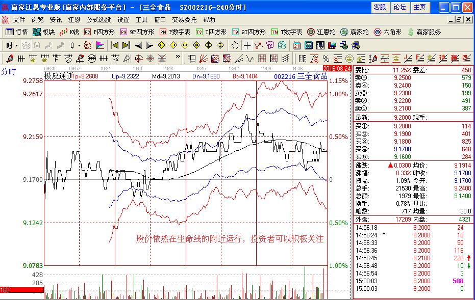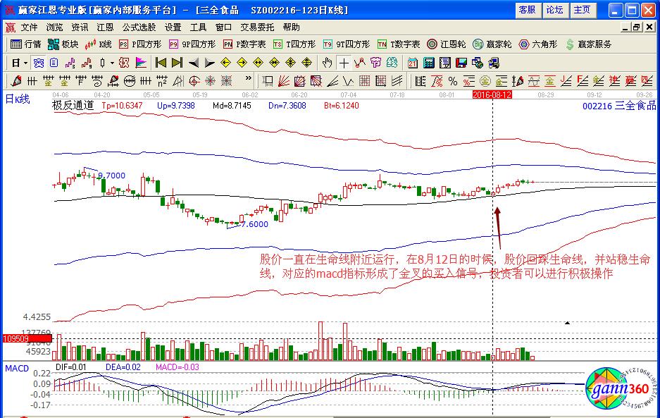 那么在了解了基本的消費類股票之后,投資者應該怎樣分析消費類股票呢,我們可以通過三全食品(002216)的個股走勢進行分析,如圖該股在2016年8月份在極反通道生命線附近的走勢,股價在8月12日的時候,回踩生命線,是在強勢區(qū)域中運行,而且對應的macd指標給出的是金叉買入的操作信號,投資者可以大膽的進行買入操作,同時注意其上方藍色上軌線是股價上漲的壓力位置,在不突破壓力出現(xiàn)下跌回調(diào)的時候,可以考慮賣出操作。