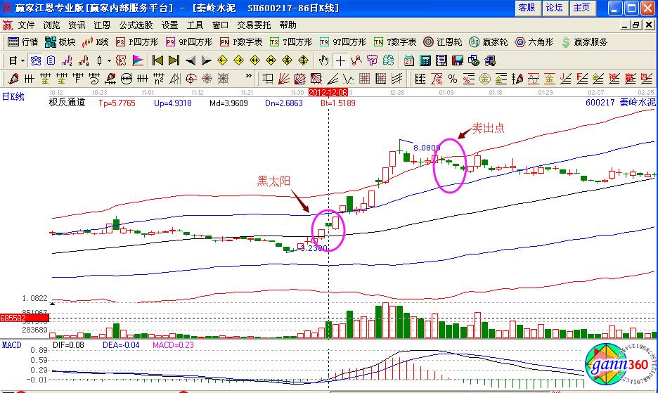 具體的實戰操作案例如圖600217(秦嶺水泥)在2012年12月6日的股價走勢形態變化,在上漲的過程中,出現了黑太陽的K線走勢形態,處于均線的上方運行,預示著后期后很大的上漲空間,這個時候投資者可以在次日的時候進行中短線的建倉操作,并做好實戰操作的盈利準備。