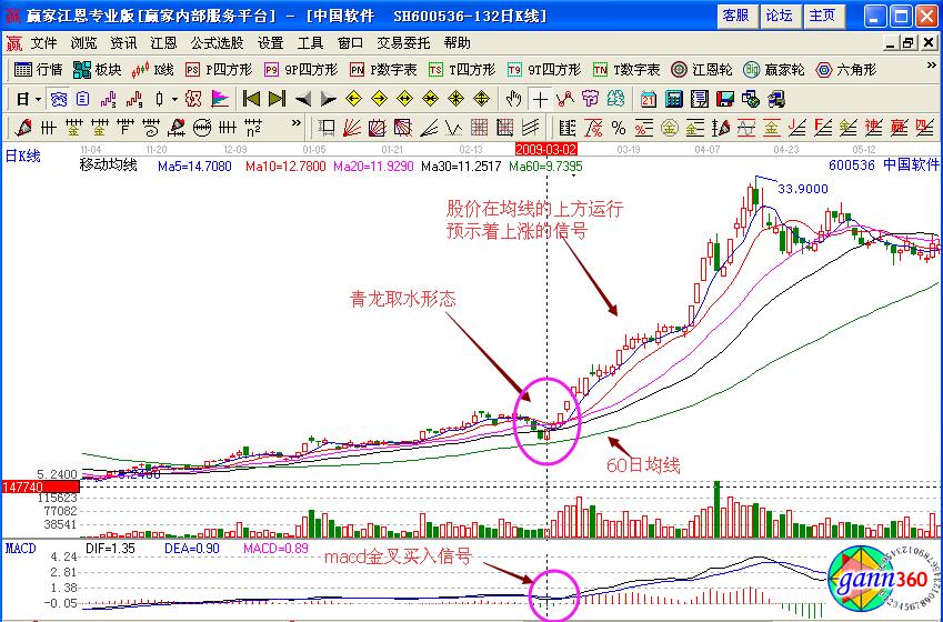 如圖中國軟件(600536)在2009年3月2日的時候,股價前期一直處于下跌徘徊的走勢,并形成了青龍取水的形態,也就是牛股龍形,之后股價在60日均線的附近位置下跌之后,繼續反彈上漲,并沒有跌破60日均線,之后股價在均線的上方運行,均線形成多頭排列的形態,是一個強烈的上漲信號,投資者可以在該點位置進行買入操作。
