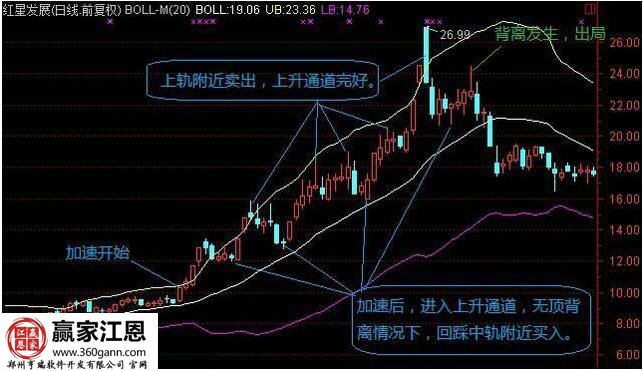 股價加速上漲,在尖頂回落中軌,一般是買入的機會,其后至少有一次上攻,上攻力度比較強,能夠再次攻擊上軌,構成了上升通道,當股價回落中軌的時候可以進行再次買入,如果力度比較弱,構成背離形態,就需要及時的出局。具體的走勢形態如下紅星發展的K線走勢變化。
