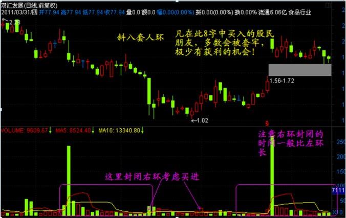 由于在8字中買入被套的風險比較大,那么投資者應該怎樣進行規避,如圖雙匯發展(000895)在2001年12月到2002年7月的行情走勢,出現了兩次非常標準的斜8套人環,股價是處于下跌的走勢形態,而投資者在8字中買入必然會有被套的風險,最好的就是在封閉右環的是考慮買進操作,而投資者需要注意的是右環封閉的時間一般比左環要時間長。