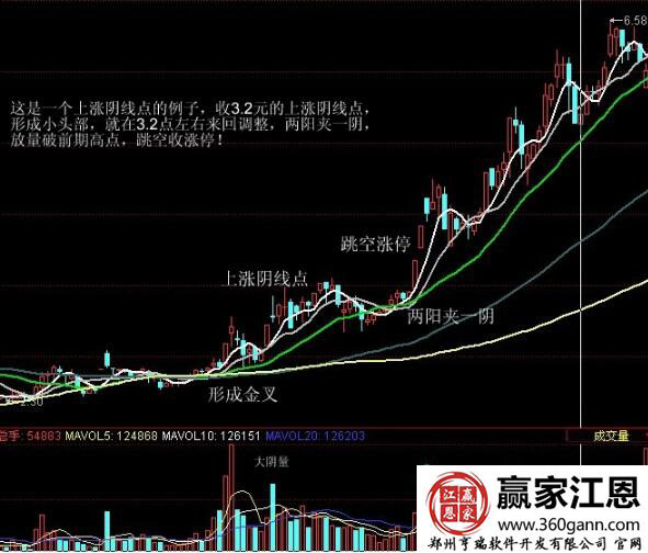 股價K線是有陰線和陽線之分的,但是陰線陽線都是存在操作機會的,比如是上漲陰線點就是投資者介入的操作機會,下面我們就借助股票行情分析軟件進行具體的研究學習: