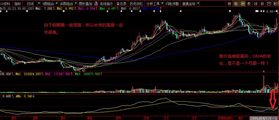 該股在接下來(lái)的第二天是跳空高開(kāi),跳空漲幅收盤(pán)之后,DMA指標(biāo)以及均線系統(tǒng)都有所變化,且5、10、30日均線都頂在股價(jià)的屁股上了,之后股價(jià)3天的漲幅,已經(jīng)把DMA修復(fù)的特別好,再看DMA白線與黃線的關(guān)系,想弓箭一樣,如下圖所示。