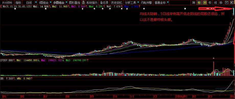 幾個(gè)交易日后,股價(jià)出現(xiàn)再次突破,那么是再來(lái)很多個(gè)漲停呢?還是假突破呢?股價(jià)已經(jīng)連續(xù)漲停10幾個(gè)交易日了,歷史上就沒(méi)有超過(guò)這么多漲停板的,再看下面圖中最后一天的前一天是高開(kāi)低走的大陰線,而且最后一天的下影線很長(zhǎng),說(shuō)明盤(pán)中跌幅很深,日線收陽(yáng)是因?yàn)槲脖P(pán)快速拉高所致。走人為上。
