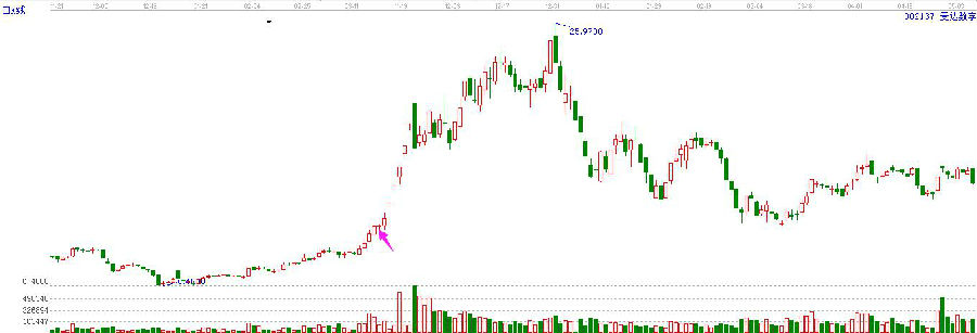 在上漲過程中,前面一根大陽線,在大家都認(rèn)為要開始一波行情,積極看好的時(shí)候,第二天卻收出來一個(gè)十字星,這會給投資者一種個(gè)股也沒有那么強(qiáng)勢的錯(cuò)覺,然后會選擇逢高出局,結(jié)果后市連續(xù)快速拉升,不再給散戶介入的機(jī)會。這是一種很典型的洗盤手法,將浮籌洗出之后,輕裝上陣?yán)_(dá)到自己的目的。遇到這樣的十字星,一定要耐心,堅(jiān)定,勝得過莊家的“流氓”行為,才能賺得后面的大幅利潤。