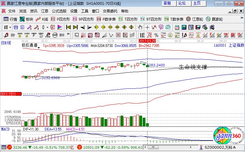 買入:個股達到了預期的支撐價位,做好買入準備。但要進一步保證買入的成功率,需結合具體的盤面走勢。若大盤當日無大礙(上漲或震蕩),縮量跌到支撐位,盤口穩健且日內量、價、指標等出現底背信號,則直接掛單買入;反之,若大盤走弱,放量跌破預期價位,則不要急于買入,耐心等待市場給出穩健的買入信號再行動。如現在上證指數在極反通道指標的生命線位置就是支撐位,如果跌破那么就要進入到弱勢了。