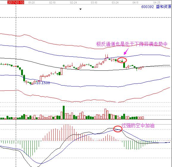 在股價進行拉升后,進入空中加油的表現期,此時沒有綠柱放大,macd的兩條平均線粘合再次出現金叉走勢。這時候就是可以重點關注的時候。比如最近的三元股份(600429)走勢就符合這樣子的走勢,結合贏家江恩軟件的極反通道走勢更為確定。