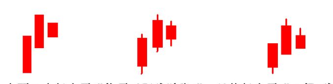 上面的這三種組合圖形都是陽線跛腳形,我們看到這些組合圖形的三根K線都是有陽線所組成的,前面兩根K線都是低開,而后面兩根則是由身懷六甲組合所形成,而且最后一根K線收盤價已經是不在繼續走高了。