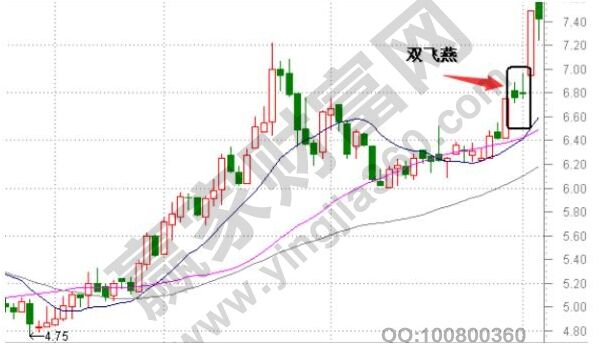 股票雙飛燕K線技術(shù)形態(tài)是怎么樣的?該形態(tài)的具體走勢為:K線走勢上呈現(xiàn)大陽之后兩根并排上揚,成交量和振幅逐步遞減的十字星,而且均線系統(tǒng)上通常是以完美的多頭排列,價格沿著10日均線強勁攀升,如下圖所示。