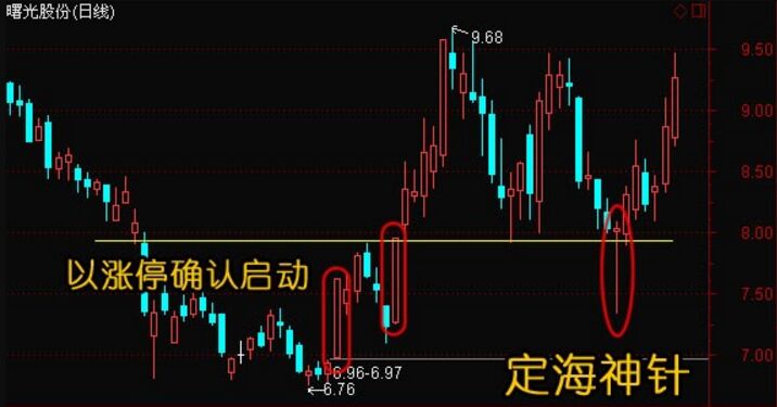 曙光股份在出現回踩支撐位,次日當太難上漲,緊接著繼續上漲,并且出現了明顯的定海神針形態。如下圖所示。