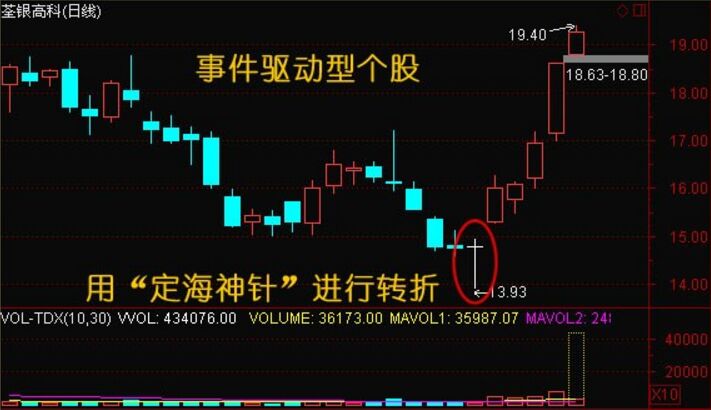 在出現定海神針形態之前,股價是需要經過一波的下跌的。下影線越長的話,它的探底回升的概率就會變得越大,如果下影線的位置正好處在某條重要均線或形態的支撐位上,后市形成的反彈概率是比較高的。