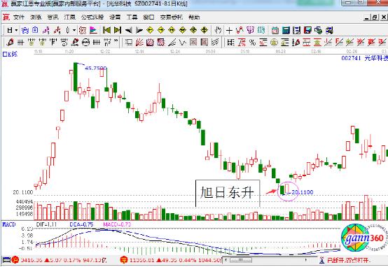 上圖是光華科技在2016年1月份的走勢圖,圖中我們可以看到該股在1月28日和29日形成了典型的旭日東升信號,我們在觀察該形態(tài)的話,它是在經(jīng)過了大幅度的連續(xù)下跌之后,在底部出現(xiàn)的,在出現(xiàn)該形態(tài)之后,股價(jià)開始進(jìn)行上漲,顯然是一種非常符合標(biāo)準(zhǔn)的見底回升形態(tài)。