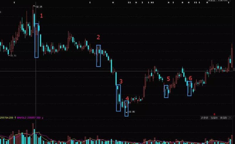 圖中用序號(hào)標(biāo)示的是六處類似金針探底的K線,那每一處都是探底嗎?顯然并不是。下面就是逐一的介紹。
