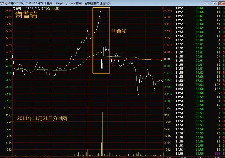 釣魚線形態是怎么來的?在個股當日即時走勢中,主力迅速拉高股價,開始基本保持某一斜率地上行,漲幅超過7%,之后突然直線大幅跳水,主力大單拋貨將下方追漲的買盤一網打盡,形成類似一根“魚桿”及垂釣的“魚線”的圖形,這其實就是釣魚線名稱的由來,如下圖所示。