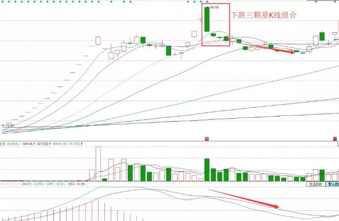 2、 如果在下跌末期出現下跌三顆星,則要通過多種角度來分析,如均線系統、指標、量價關系來進行綜合分析,是否會止跌反彈。