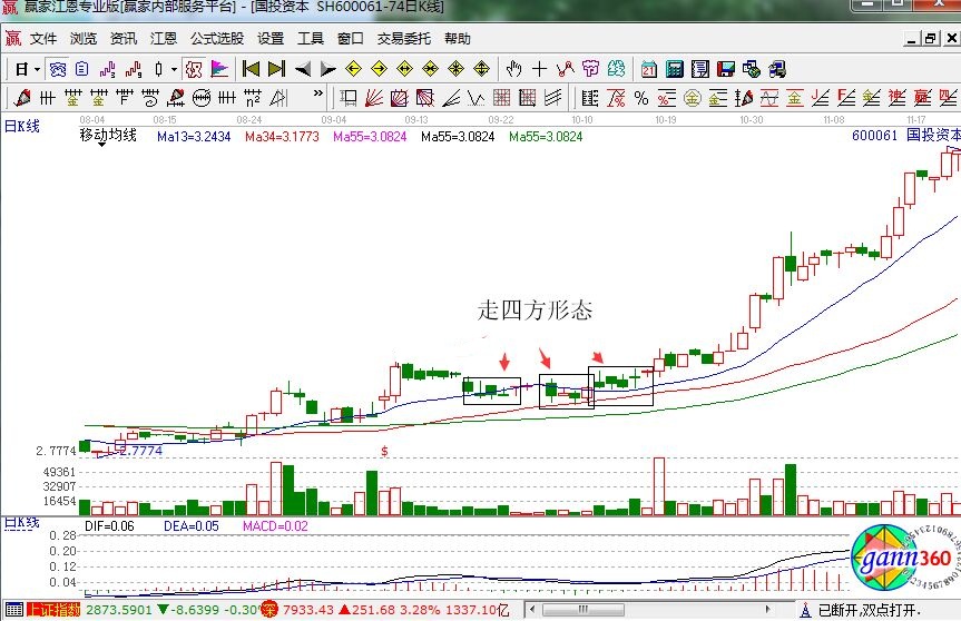 投資者在識別“走四方”形態的五個條件,具體為:成交量遞減會極度萎縮的走勢,KDJ指標黃金交叉,股價剛剛脫離底部區域,漲幅不大正在做平臺,55日均線開始走平或者翹頭向上,股價站在13日均線或者34日均線上,形態出現后,如果“走”后有量,則“四方”成立。