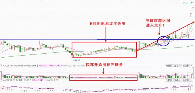 芝麻量是什么?它其實指的就是:在莊家建倉完畢時,股價已經(jīng)有升高,為了清洗浮動籌碼,莊家開始震倉,震倉是否有效的標(biāo)志是該拋的都已拋出,未拋的短期內(nèi)不一定會拋,這就是量極度的萎縮,震倉必須震到量極度萎縮才算股價見底。所以這時候極度萎縮的成交量信號,就能大概率把握到震倉結(jié)尾后大波段起漲前的買入位置,相應(yīng)的圖形如下。
