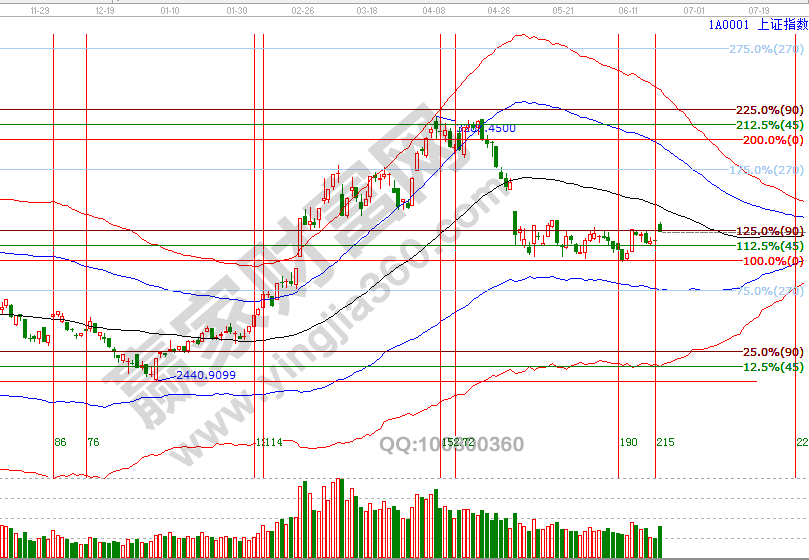 大盤跳空脫離近幾日持續談到的關鍵位,盤中最高沖擊至第一目標位2950點,回顧近期思路,10號早盤收復2840點按照規則開倉,2880-2890為持倉關鍵位,連續三個交易日收盤關鍵位,分析的觀點是不破延續反彈,今天盤中到達第一目標位后,按規則賣在壓力,5成倉或以上者可以獲利部分籌碼,剩余倉位繼續持有,未來幾天關注江恩價格四方形與百分比延伸線2911-2900點,此區間震蕩不破延續震蕩反彈動作。6月20號盤中壓力是225度2944點、180度2928點,盤中支撐是90度2894點。操作策略,指數處于極反通道弱勢區域的反彈走勢,繼續關注2911-2900區間不破延續反彈,整體持倉保持3成左右。