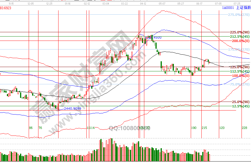 市場(chǎng)走勢(shì)同20號(hào)分析一致,圍繞日線極反通道黑色生命線上下震蕩,按歷史規(guī)律,自下向上的突破生命線需要量能及3天時(shí)間確認(rèn),指數(shù)收盤價(jià)一直在生命線上,不足之處是量能出現(xiàn)持續(xù)萎縮,27號(hào)江恩時(shí)間窗口盤中關(guān)鍵位2966點(diǎn),結(jié)合周期關(guān)系,整體還處于反彈周期內(nèi),6月27號(hào)盤中壓力是0度2997點(diǎn)、45度3016點(diǎn),盤中支撐是2966點(diǎn)、2944點(diǎn)。操作策略,指數(shù)圍繞極反通道生命線震蕩,延續(xù)反彈走勢(shì)中,整體持倉保持3-5左右,7月3號(hào)時(shí)間窗口選擇方向。