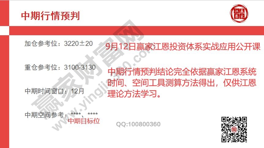 8月初贏家團(tuán)隊(duì)對(duì)大盤做定性,市場(chǎng)進(jìn)入于第一階段的修整期,在此期間市場(chǎng)不創(chuàng)新高走勢(shì)為震蕩緩跌,以大箱體底倉(cāng)+活動(dòng)倉(cāng)做應(yīng)對(duì)策略,在時(shí)空測(cè)算方面,9月12號(hào)周六公開課對(duì)外揭秘市場(chǎng)中期時(shí)空參考信號(hào)(8月份用三節(jié)內(nèi)部課已對(duì)正式學(xué)員提前做解讀)、自公布測(cè)算空間數(shù)據(jù)后,市場(chǎng)已三次觸及3220位置,具體時(shí)間分別是9月11日、9月29/30日、10月25日,前兩次均有不同程度的反彈,本次對(duì)市場(chǎng)的影響44周周報(bào)略有描述,既定28號(hào)內(nèi)部培訓(xùn)課講述未來一段時(shí)間的操作應(yīng)對(duì)策略。