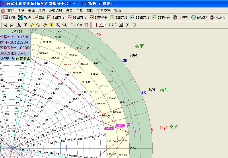 ☆依據時間正方形提示:24節氣12.21大盤遇到輪中輪45度位置,看跌。下一時間窗口在2013.1.2日了