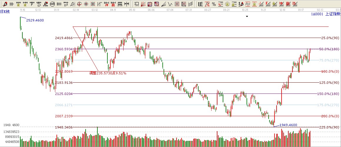 ★依據贏家波段百分比伸線提示:大盤收盤依然在180度2360壓力下方,,只要突破這里才會看高至90度位置2420附近。