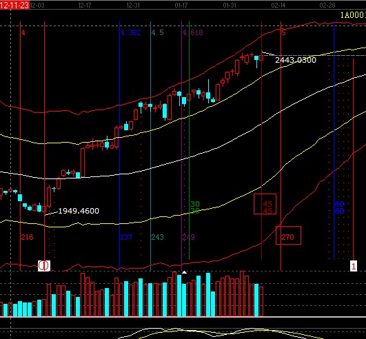 大盤自1949點已運行45個交易日,一舉突破站穩生命線及強勢外軌線線,整體趨勢生命線不破做多觀點不變,操作可通過提升止損位保護收益或倉位上做高拋低吸降低成本,21號是本周時間窗口,短期支撐2425-2414,阻力2446-2460;