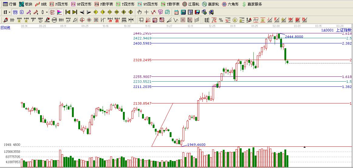 ☆依據(jù)贏家黃金價格延伸線提示:大盤如期跌至黃金分割延伸線2倍位置,短期構(gòu)成壓力,這里不過看低一線至1.618位置2255附近.