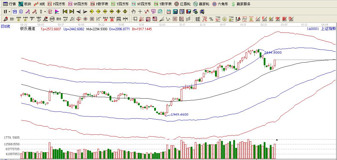 綜上所述:大盤處于極反通道生命線2294.90點(diǎn)附近,按照極反通道應(yīng)用法則極反通道生命線不破看高一線至2442點(diǎn)藍(lán)色上軌位置。