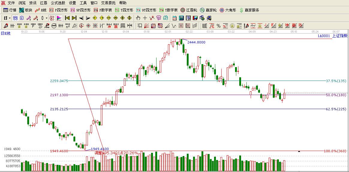 ☆依據江恩波段百分比提示:大盤如期構筑小雙底再度運行在其180度位置2197點上方,按照規則這里不破有望挑戰135度位置2259點高點。