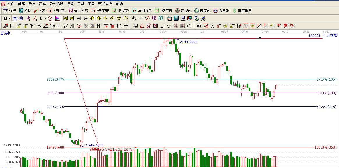 ★依據江恩波段百分比提示:大盤站穩150度位置后直接緊逼135度位置2259點高點,說明了其180度的一個重要性。注意上方135度壓力。不過注意大盤再一次回調走弱。