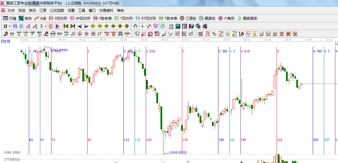 ☆依據贏家江恩系統乾坤K線提示: K線顏色為紫色信號,等待市場方向的選擇;
